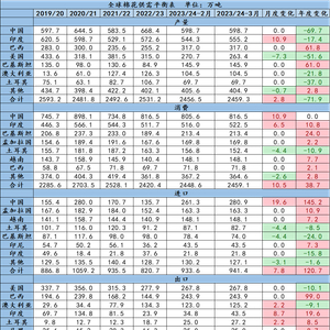 全球23/24年度棉花进口上调7.8万吨,其中中国进口上调19.6万吨,持续关注后续中国对于美棉和巴西棉的进口情况,中国已经买了大量进口棉,后续采购需求或有所走弱;土耳其进口下调4.4万吨,巴基斯坦进口下调4.4万吨。