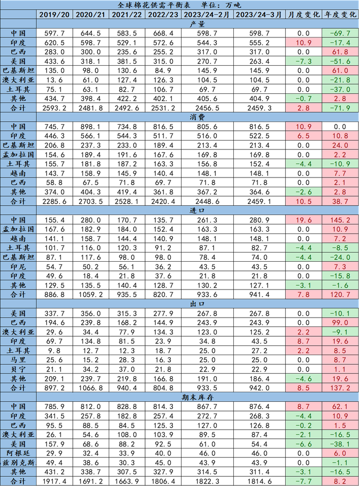 23/24年度全球消费上调10.5万吨,其中中国消费上调10.9万吨至816.5万吨,虽然从去年四季度开始中国对于美棉和巴西棉采购总体偏好,但市场普遍预计部分进口棉或直接进入储备,结合目前情况来看,中国的消费存在高估的可能;印度消费上调6.5万吨至522.5万吨;土耳其消费下调4.4万吨。