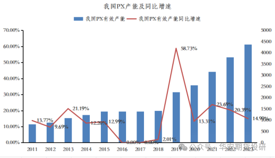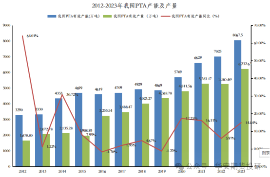 我国PX自2019年以来进入产能密集投放期,2023年底PX产能为4373万吨,2019-2023年合计新增2119万吨,翻了接近一番,由于我国99%的PX均用于生产PTA,那PX产能的快速增长是否意味着我国PTA的快速增长呢?