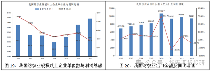 纺织行业的景气程度对PTA的需求也有着重要的影响。我国的纺织需求主要有内需零售和外需出口两方面。内需零售方面,我国纺织业规模以上企业单位数自2019年开始增加,但是利润却呈现收缩趋势;外需出口方面,受到美国制裁影响,出口额呈现缩减趋势,同比增速也在下降。