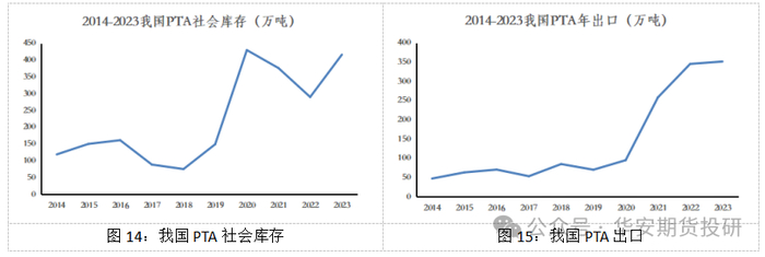 从PTA的社会库存和出口来看,由于我国产量与表观消费量差值越来越大,因此社会库存和出口数量也呈现上升趋势,我国PTA出口国主要是印度、越南和埃及等。