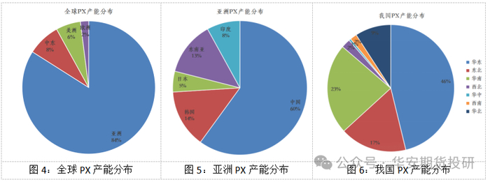 全球PX产能分布区域化特征明显,全球PX产能有近84%集中在亚洲,东亚又是亚洲集中的PX生产区域,产能占全球的66%左右,主要分布在中国、日本和韩国;国内的产能分布同样呈现集中格局,有86%的PX产能集中在华东、东北和华南。