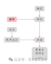 PTA产业链的终端为纺织业,纺织原材料有棉、麻等天然纤维以及涤纶长丝等化学纤维,棉花与短纤一起纺纱进入织造端,与同进入织造端的长丝是互为替代品,最终应用于服装业、家纺业等多个领域。
