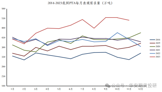聚酯终端需求有明显的淡旺季之分,一般而言,3-4月份和9-10月份是聚酯及下游纺织传统旺季,春节前后和夏季是纺织的传统淡季。通常在下游旺季来临之前,工厂和贸易商会选择提前备货,带动PTA需求上升,因此PTA的需求在第二、三季度明显走强。