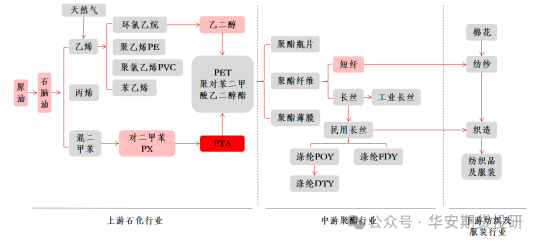PTA产业链:PTA行业是重要的中游行业,上游承接石化行业,下游衔接化纤行业。上游原材料以石油、天然气等石化资源与MX、PX等化工产品为主,下游行业主要有聚酯纤维、聚酯瓶片和聚酯薄膜,其中聚酯纤维占比最大,其终端的纺织业与PTA也息息相关。