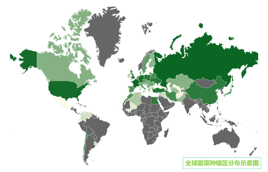 甜菜生长于温带地区。主要分布在欧洲和北美的发达国家,如欧盟、美国北部和加拿大,少量在亚洲地区,如日本、俄罗斯和我国北部等。一些国家如中国、美国、日本、埃及、西班牙、阿根廷和巴基斯坦既生产甘蔗糖又生产甜菜糖。我国是世界上用甘蔗制糖最早的国家之一,已有2000多年的历史,而用甜菜制糖的历史只有几十年。从全球看,利用甘蔗生产食糖的数量远大于甜菜,两者的比例已接近8:2。