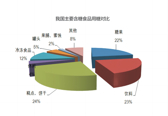 工业消费主要指食品加工用糖消费,主要用于糖果、碳酸饮料、果汁饮料、速冻食品、罐头、糕点、饼干、乳制品、果脯、蜜饯等生产,其中糖果的单位重量用糖比例最高,碳酸饮料由于产量很大,也是重要的食糖用途。