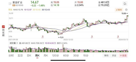 3月14日收盘时,紫金矿业股价上涨至15.39元/股,总市值达4052亿元,股价创了上市以来新高。