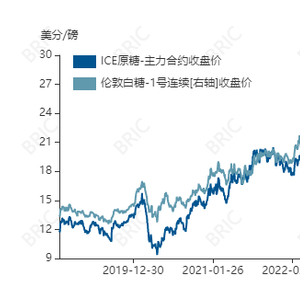 截止2024年03月20日,ICE原糖-主力合约收盘价最新值为21.8美分/磅,较上期值上涨1.16%,较去年同期上涨6.34%,2019年01月02日至2024年03月20日,ICE原糖-主力合约收盘价最小值为9.37美分/磅,最大值为27.97美分/磅,均值为17.37美分/磅。
