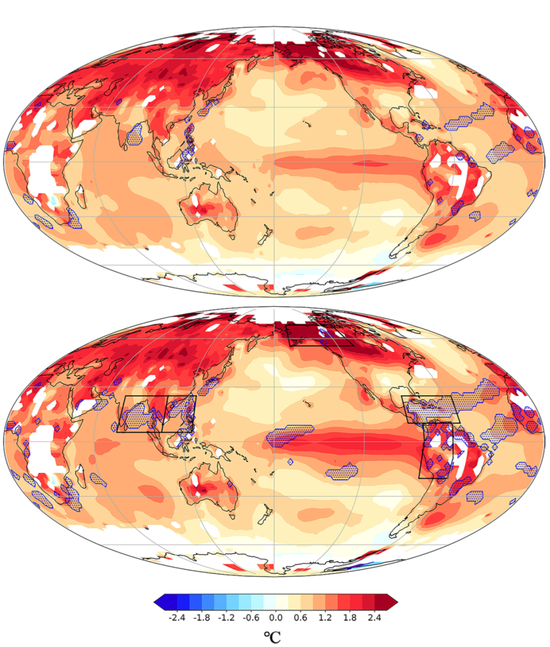上图引自发表在Scientific Reports的论文(Jiang et al. 2024),该研究认为厄尔尼诺叠加人类活动,2024年全球气温或将再创新高。蓝色阴影区域表示2024年预计会出现创纪录高温的地区,上图为在中等厄尔尼诺情境下的气温异常预测,下图为在强厄尔尼诺情境下的气温异常预测。