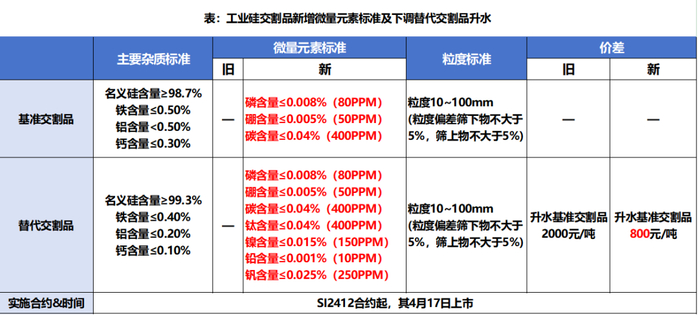 4月12日,广州期货交易所正式发布了关于工业硅期货的最新修订规则。此次修订主要围绕工业硅交割品质标准及价差调整展开,其目的在于紧密跟随工业硅下游领域的发展新趋势,优化期货市场的价格发现功能,并进一步提升期货服务实体经济的能力。下表为本次修订的具体细则: