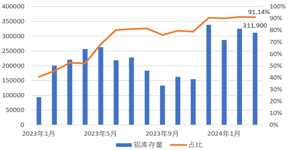 国内市场,2022年中国累计进口该国原铝66.79万吨,占原铝进口总量的69%;2023年进口俄罗斯铝锭继续增至117.5万吨(HS 76011090 含铝量<99.95%的未锻轧非合金铝),总量占比进一步提升到76.2%。当前国内电解铝产能天花板背景下,俄罗斯铝锭贸易流入,对国内铝市表观供应的影响越来越大。