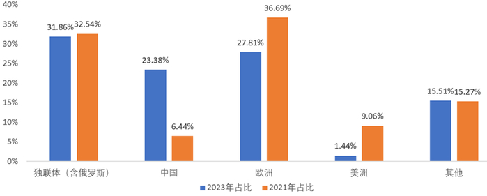 俄罗斯铜业务主要集中在乌拉尔矿业和冶金公司(UMMC,在俄罗斯称为UGMK)、诺里尔斯克镍业(Nornickel)和俄罗斯铜业公司(Russian Copper Company)三家企业。USGS数据显示,2023年俄罗斯铜精矿产出91万吨,精炼铜产出100万吨,与铝近似,俄罗斯及独立体成员约消耗铜产量的三分之一、33万吨附近,其余向独联体以外国家出口。同样,2023年中国购买了36.26万吨俄罗斯精炼铜,土耳其购买了17万吨,分列该国铜出口国的第一、第二位。欧盟整体去年削减了从俄罗斯进口铜数量的79%,仅进口6.2万吨,而战前进口吨级约30万吨。欧洲铜进口主要由智利、秘鲁补替,2023年两个南美国家向欧盟供应了41%的铜进口,2022年该指标在24%。不过数据显示,欧盟经济疲软,2023欧盟铜进口量下降了20%跌至67.31万吨。