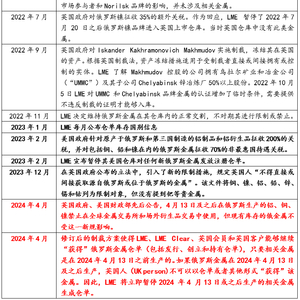 过去两年,俄乌冲突背景下,有色金属现货贸易持续重塑进出口格局,美英对俄罗斯有色金属的新一轮限制对当下市场供应影响不大。不过,可注册标的的减少,可能加大LME金属市场相关品种的挤仓风险,也将影响内外比价。日常需要加大对LME期货仓单、注销仓单比例、0-3月现货升贴水及持仓数据的跟踪。地缘政治日益升温的大主题下,LME市场定价溢价的风险将普遍高于国内以更加关注供求定价为主的内核。
