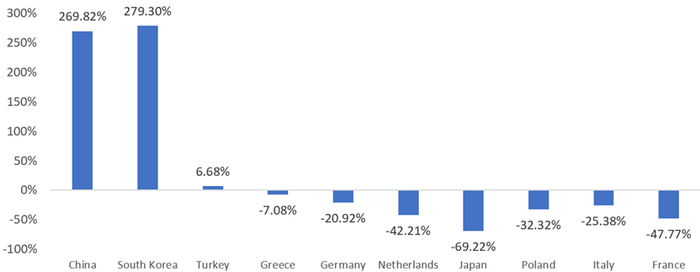 俄罗斯铝业集团几乎是俄罗斯唯一的铝生产商,年报显示该集团2023年铝产量380万吨,其销售收入来源与战前相比已发生巨变,欧洲业务与美洲业务收入占比大降。如2021年俄铝向美国赚取销售收入7.41亿美元,但2023年已为0。欧洲地区需要注意,土耳其始终是俄铝位列前三的贸易伙伴,去掉土耳其后,俄铝对欧洲销售收入占比从2021年的27%降至去年的18%,挪威已基本不进口俄铝产品,荷兰业务下降较大。俄铝业务主要转向东亚,除中国进口俄罗斯铝业务量大增外,美国盟友出现了“韩增日降”趋势,韩国目前是俄铝仅次于中国的第二大贸易伙伴,销售额从战前的3.14亿美元大增至11.91亿美元,日本则不及2021销售收入的1/3。