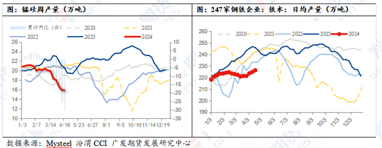 目前成材暂无重大矛盾,利空出尽下锰硅跟随修复。螺纹维持低产量下库存顺利去化,库存绝对值降至历史同期低位水平。尽管热卷短期有一定供应压力,但建材下游需求缓慢恢复后,钢厂重新转产至建材,将在一定程度上缓解供应压力。4月23日,发改委表示已联合财政部完成2024年地方政府专项债券项目筛选工作,共筛选通过专项债券项目约3.8万个、2024年专项债券需求5.9万亿元左右,将更多新能源、新基建、新产业领域纳入专项债券投向领域。预计整体终端需求将继续边际改善。月底正值钢招,静待钢厂对锰硅的定价。