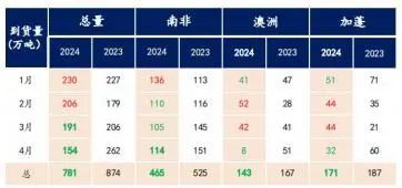 2024 年 1-4 月,到货总量 781 万吨,同比-10.6%;1-4 月澳洲到货量 143 万吨,同比-14.4%。