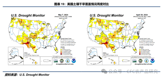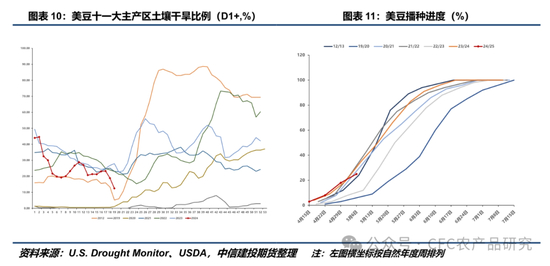 图19显示美豆产区干旱覆盖比例显著下降,主要因过去一周美豆产区持续经历温和的降雨天气,配合适宜的温度,使得土壤墒情明显好转。前文图13显示未来一周美豆产区持续零星阵雨天气,这可能会令美豆播种进度继续有所放缓。但从另一个角度,改善的土壤墒情亦有利于前两周播种的大豆发芽出苗。
