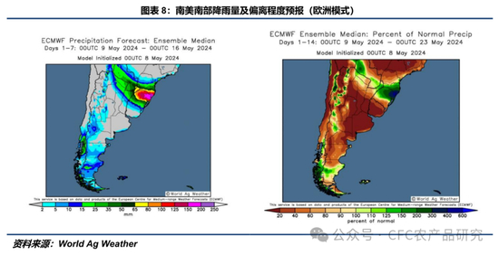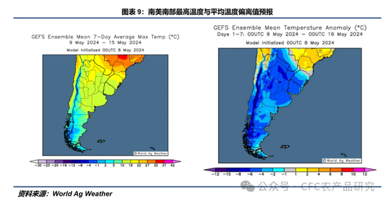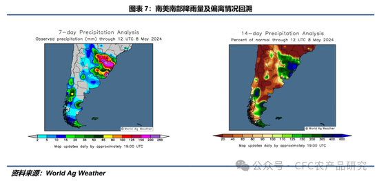 World Ag Weather显示,过去一周(0501-0508),南里奥格兰德州迎来极端降雨天气,全州7天累计降雨量超过150mm,中部区域甚至达到250mm以上,最高气温较历史水平偏高2-4℃。阿根廷四大主产省7天累计降雨量均在20mm以下,最高气温较历史平均水平偏低2-4℃。过去两周(0424-0508),除圣地亚哥-德尔埃斯特罗省外,其余主产省14天累计降雨量均低于历史平均水平。南里奥格兰德州14天累计降雨量达到历史平均水平的400%以上。