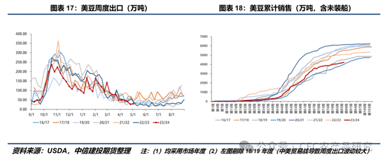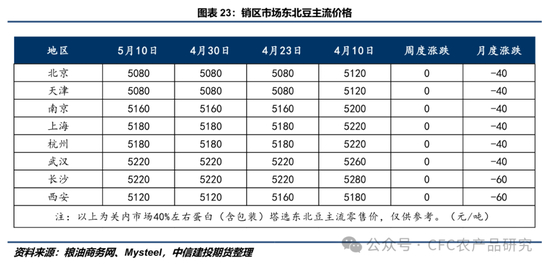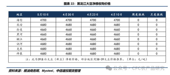 本周国储分别进行竞价拍卖与采购各一场,其中拍卖底价设定为4500元/吨,全部流拍,反映出当前中下游企业库存相对充足,在终端需求较为疲软的背景下,没有动力去接手国储投放的低价豆源。竞价采购底价为4650元/吨,同样全部流拍,表明这一价格已不足以吸引市场主体参拍,暗示着此前中下游企业平均建库成本或在4650元以上,进而我们理解4600-4650可以成为短期内研判盘面下边界的锚。