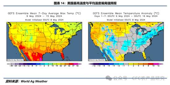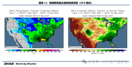 GFS模型显示,在中性情形下,未来一周(0509-0516),多数主产州降雨量预计不会超过25mm,印第安纳州与俄亥俄州部分区域可达到25-50mm。主产州最高气温预计在16-27℃,多数主产州平均气温预计与历史平均水平持平或偏高2-4℃。未来两周(0509-0523),除明尼苏达州局部、爱荷华州东北部、阿肯色州、印第安纳州以及俄亥俄州外,其余主产区14天累计降雨量预计低于历史平均水平。(注:天气预报具有实时性,请及时关注World Ag Weather或NOAA的每日预报。)