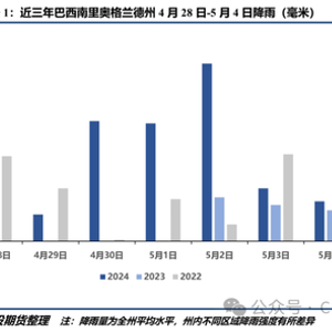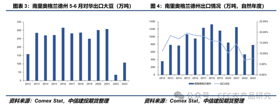 南里奥格兰德州作为巴西第二大大豆主产州,亦是巴西大豆主要出口州之一,里奥格兰德港是该州核心出口港口。Comex Stat数据显示南里奥格兰德州近几年对外大豆出口量在550-1250万吨左右,占巴西全年出口量的比例约7%-15%。除去2022年(巴西全国减产)和2023年(南里奥格兰德州大幅减产),过去南里奥格兰德州5月-6月对华大豆发船量在250-320万吨左右。在暴雨影响下,通往港口的道路设施被破坏,物流恢复亦需要时间,因此原本计划5-6月发船的大豆或将被推迟,从而影响中国国内7-8月的大豆到港,这可能会对国内DCE豆粕价格产生短期向上推动作用。此外,国内油厂还可能在巴西大豆到港不足的情况下,转向采购美豆旧作以补充库存,届时或给CBOT大豆带来反季节性“繁荣”。