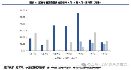 仅从数据层面来看,南里奥格兰德州农业机构EMATER估计截至4月26日该州大豆收割完成66%,截至5月2日完成76%。巴西多数机构预估本年度南里奥格兰德州产量为2150-2250万吨,按照暴雨发生时尚有20%-30%的未收割大豆做估算,意味着大约450-650万吨的大豆暴露在洪涝风险中。