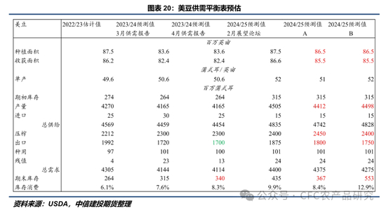 (3)23/24南美:主要关注本次报告是否会将巴西南里奥格兰德州暴雨对该州大豆产量造成损失纳入评估,从而下调巴西产量预估。此外,布宜诺斯艾利斯谷物交易所周度报告连续两周表示因不利天气影响,此前5100万吨产量预估可能面临下调。阿根廷本年度自播种以来整体天气条件良好,尽管1月下旬到2月上旬短暂面临高温少雨天气,但随后降雨及时回归,优良率表现远远好于去年同期。本次报告即使对阿根廷产量进行调整,预计幅度也不会很大。