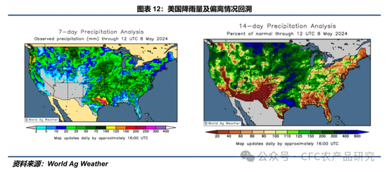 World Ag Weather显示,过去一周(0501-0508),多数主产州7天累计降雨量在35-75mm,极少数区域达到100-125mm。平原地区最高气温较历史平均水平偏低2-4℃,玉米种植带最高气温较历史平均水平偏高1-4℃。过去两周(0424-0508),多数主产州14天累计降雨量高于历史平均水平,一些州部分地区14天累计降雨量达到历史平均水平的300%以上。