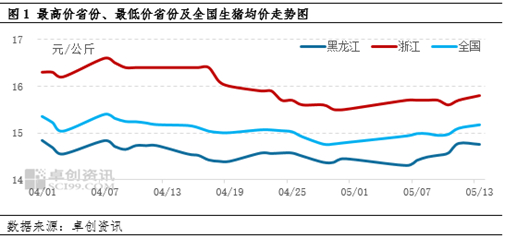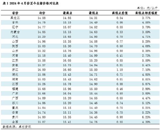 图1选取该时段的均价最高省份及最低省份进行对比,进入4月下半月后,浙江作为全国高价区,价格亦跌破16.0元/公斤,此后震荡盘整,与全国最低的黑龙江逐步缩小价差。