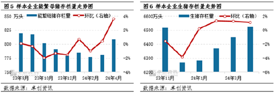 从能繁母猪数据来看,自2023年9月份开始,能繁母猪存栏量下降,生猪可出栏量在一定程度上减少。但与此同时,集团进入2024年后逐步停止去产能动作,转为增加产能,市场规模化程度进一步提高,对行情的影响力更强,生猪供应减少的幅度或放缓,结合中小场及散户去产能的情况,6-7月份生猪供应量或小幅下滑。