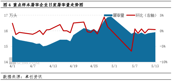 从需求量来看,生猪屠宰量进入震荡状态,屠宰量4月先降后涨,5月份再度下降。4月份生猪日度屠宰量环比增加6.79%,最高点16.92万头。而进入5月份后,生猪日度屠宰量降至15.76万头。在供需博弈的状态下,猪价呈区间内震荡调整状态。