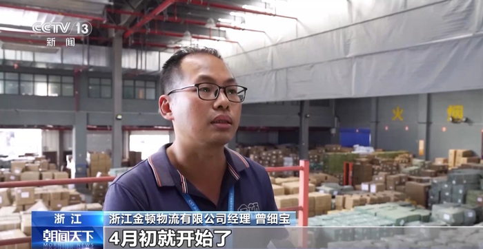 浙江金顿物流有限公司经理 曾细宝:4月初就开始了,这仓库现在已经有点爆仓的状态了。客户根据运价,可能再调整一些出货计划,运价太高的话可能会往后面推迟、延迟一些。