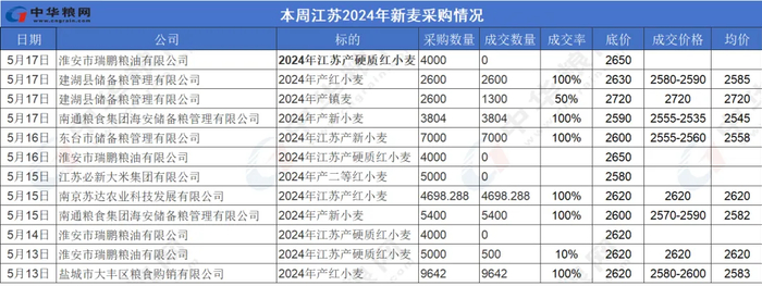 5月17日建湖县储备粮管理有限公司采购2024年产红小麦2600吨,全部成交,底价2630,成交价2580-2590,成交均价2585,较上期5月9号成交均价下跌15元/吨。