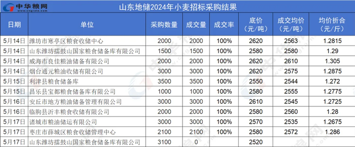 5月17日山东潍坊擂鼓山国家粮食储备库有限公司竞价采购2024年产非雨后非烘干小麦3100吨,底价1.26元/斤,全部流拍,上期5月14日成交价1.29元/斤。