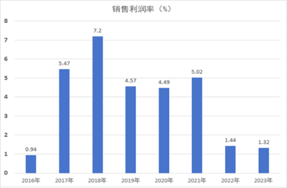 我们姑且把时间线拉长,将进口铁矿石价格与钢材价格进行对比可以发现,矿价和钢材价格具有一定的相关性。仔细研究进一步可以发现,2022年6月份以来,钢材价格指数平均水平在110点附近,进口铁矿石价格平均在115美元/吨;而刨除掉2020年末和2021年的矿价和钢价特殊值外,2017年-2020年这4年时间里,钢材价格指数也基本在110点附近,进口铁矿石价格基本维持在85美元/吨附近。2017年到2018年进口铁矿石价格平均为70美元/吨,同期钢材综合价格指数为112点。再来分析利润率。根据中国钢铁工业协会对重点钢铁企业的监测数据,2017年-2023年间,行业平均利润率分别为5.47%、7.2%、4.57%、4.49%、5.02%、1.44%和1.32%。