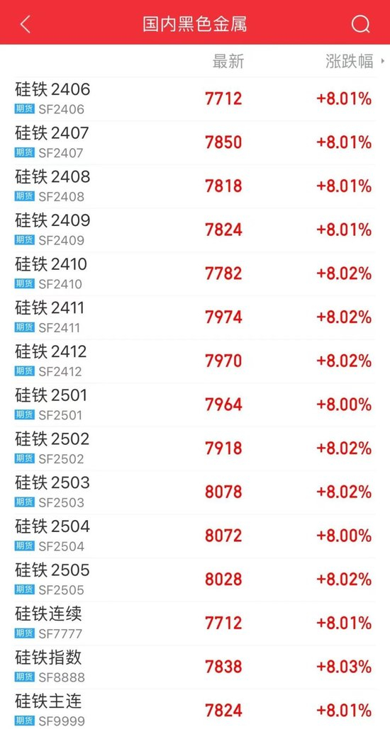 昨日早盘,硅铁主力合约2409强势涨停,截至收盘,硅铁期货全线涨停。