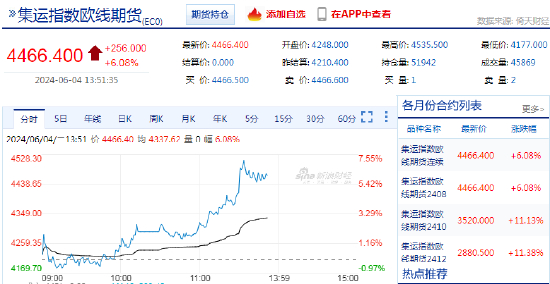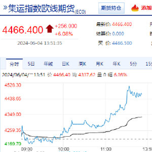 2024年6月4日午后开盘,集运指数(欧线)主力合约向上触及4500.0点,日内涨超6%。