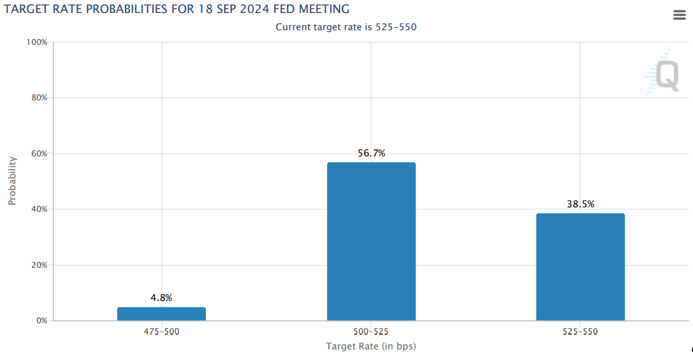 同时,据芝商所FedWatch公具分析,美联储8月维持利率不变的概率为91.7%,降息25个基点的概率为8.3%。9月维持利率不变的概率为38.5%(看下图),累计降息25个基点的概率为56.7%,累计降息50个基点的概率为4.8%。