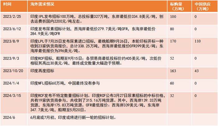 2023年,出口数量受国际尿素价格较高和印度招标数量较大共同影响大幅度超过预期,成为下半年扰动尿素价格的重要因素。