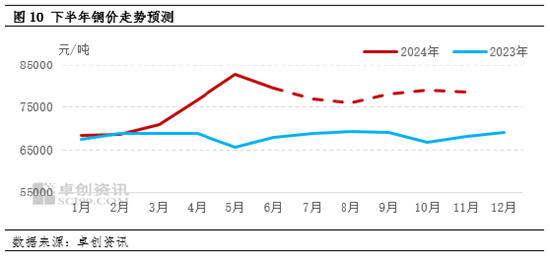 以上为下半年影响价格的主要驱动因素,基于当前市场情况,对价格做如下预测:未来六个月铜价或呈现先跌后涨走势,上涨趋势难破高点,下跌趋势难破7万元关口,主要运行区间在76000-79000元/吨。后期来看,铜价的回落能否使得库存拐点提前到来是较为关键因素,7.8月为传统的需求淡季,且铜价趋于8万元上下的位置,在下游心中为较高点位,库存将在7.8月得到消耗。下半年,铜产量或继续受影响,上半年产量缺口主要受精废价差扩大,阳极板的产出来弥补,但当前电解铜价格下跌,废铜已不具备很强的替代优势,且下半年仍有冶炼厂有检修计划,供应得到一定收窄,此局面大概率出现在金九银十的需求旺季,而后进入年末,一年之内的收尾环节,铜价上涨得到削弱,偏强运行为主。