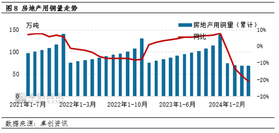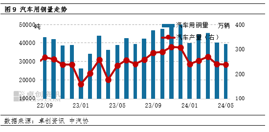 汽车行业,中汽协统计,2024 年 1-5 月,汽车产销分别完成 1138.4 万辆和 1149.6 万辆,同比分别增长 6.5% 和 8.3%。据卓创资讯监测,1-5月,汽车用铜量在20.9万吨,同比增幅16.8%,同比增长主因高基数导致,在前期政策面的带动下,新能源汽车出现产能过剩局面,2024年年初降库存操作开启,产量受限,所以分月来看,整体需求依旧较弱。