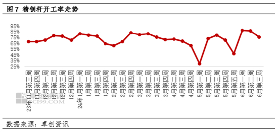 精铜杆主要下游终端集中于,国家电网、高压线缆以及漆包线,据国家能源局统计,1-5月,全国电源新增生产能力(正式投产)3243万千瓦,其中,水电397万千瓦,火电1932万千瓦;1-5月,全国全社会用电量累计21889亿千瓦时,同比增长1.1%;其中重工业用电量环比下滑明显,降幅达1.3%。精铜杆终端行业国家电网依旧保持稳增长态势,除此之外漆包线也成为铜杆亮眼产品,5月中旬精铜杆开工率出现回落达29.81%,高铜价使得杆企不得不停产,采取代加工的方式来分摊成本,更是有部分小型企业因资金周转不畅而倒在这波风雨之中,后期因铜价回落,开工率逐步回升,运行于80%左右的开工水平。