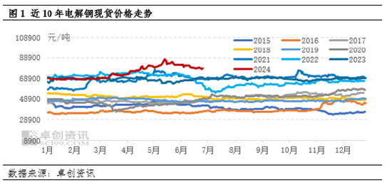 【导语】2024年上半年电解铜市场冲高回落,并在5月20日创下历史高值,成为有色中较为亮眼的品目。截至6月27日,卓创资讯1#电解铜1-6月份市场均价在79456.67元/吨,同比上涨17.06%,均值波动区间在68000-83000元/吨。下半年随着下游需求的释放以及美联储降息事件的落地,铜价有望在金九银十的需求旺季再次运行于高点位置。