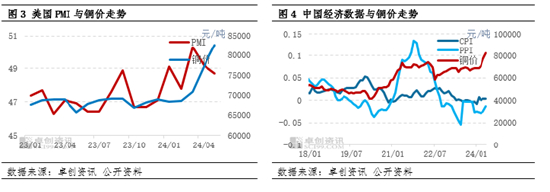 自2023年下半年起,全球经济复苏韧性较强,国内需求因一揽子政策的落地,市场预期经济复苏,铜需求向好,叠加宏观乐观情绪升温,2024年3月海外经济复苏迹象明显提升,并且呈现加速上涨。美国制造业PMI为50.3,为近两年的新高值,欧洲的制造业PMI连续呈现3个月环比上升,达48.4%,国内制造业自3月起,也出现同步回升,市场对于后市需求态度乐观,多头资金涌入有色市场,拉动盘面不断冲高,对于铜价上涨无疑形成一波强势加码。