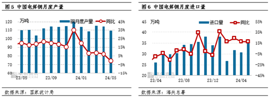 1-5月国内铜供应水平未发生较大变化,与市场供应收紧预期不符,1-5月电解铜产量558.7万吨,同比增幅8.42%。上半年供应缺口未显主要因为:一、国外矿山关停影响量并未传导至国内市场,仅为情绪发酵使然。二、电解铜运行至高点水平之后,精废价差拉大,最高值达4671元/吨,市场对于阳极板加工情绪高涨,冶炼厂也积极采购以应对铜精矿短缺带来的冲击,冶炼厂检修缺口得以弥补。