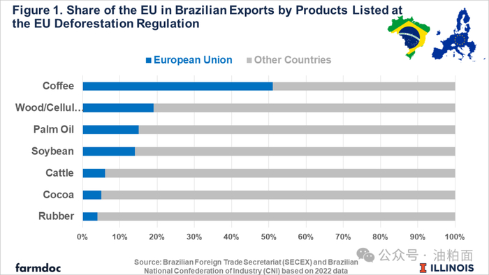 巴西是该立法范围内大多数商品的主要出口国。欧盟是巴西的第二大贸易伙伴,占巴西贸易总额的16%。巴西是欧盟第11大贸易伙伴。到2023年,《欧盟森林砍伐条例EUDR》指定的产品占巴西贸易总额的30%,其中欧洲购买了三分之一以上的出口产品。本文探讨了新欧洲反毁林法所涵盖的七种商品对巴西农业综合企业的潜在影响。