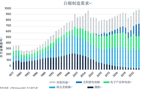 在公元前600年左右吕底亚人铸造第一批金币和银币之前,这两种金属曾一直被用于制作珠宝:白银的使用大约始于公元前2500年,而黄金的使用则始于公元前4500年。不变的是,直到现在,这两种金属的主要用途仍是制作珠宝。然而,进入本世纪以来,白银遭受了两大技术发展趋势的冲击:数字化革命与能源转型。这两者都对金银价格比率产生了影响。1999年,摄影领域消耗了2.677亿金衡盎司的白银,占当年全球白银总供应量的36.6%。到2023,由于数码摄影的兴起,摄影领域仅消耗2,320万盎司的白银,约占当年白银总供应量的2.3%。与此同时,白银在电子产品和电池中的使用量从9,000万盎司增加到2.274亿盎司,占白银年度总供应量的比例从12.3%增至22.7%,这抵消了传统摄影领域需求下降的一部分影响,也在一定程度上解释了为何在近年黄金屡创新高的情况下,白银却难以触及新的价格顶峰。然而,白银方面的利好消息是,白银在能源转型中有了新的用武之地。在过去几年中,太阳能电池板对白银的需求强劲增长,占2023年白银需求总量的20%,而在1999年,该领域的需求几乎为零(图5)。太阳能电池板可能是自2020年以来推动白银价格相对于黄金回升的部分原因。图5:在摄影领域需求缩减的同时,电池和太阳能电池板领域的需求有所增长