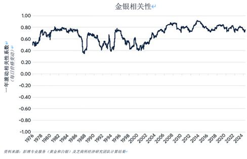 图2:自2004年以来,金银价格相关性系数一直徘徊于+0.8上下。