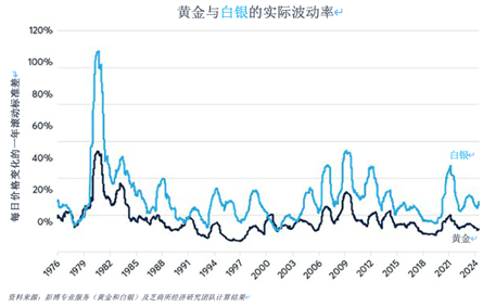 例如,当黄金和白银价格在2011年9月达到顶峰时,一盎司黄金可以购买的白银不到32盎司(图3)。而在随后的熊市期间,这一比率上升至每盎司黄金可兑换124盎司白银的程度。随着黄金和白银在2020年新冠疫情初期开始反弹,这一比率迅速恢复到64。2024年,这两种金属的价格均有所回升。其中,白银的表现更胜一筹,年内前五个月涨幅达23%,相比之下,黄金仅上涨12%。图3:正相关性加上更高的波动性,使白银对于黄金呈现出更高的贝塔